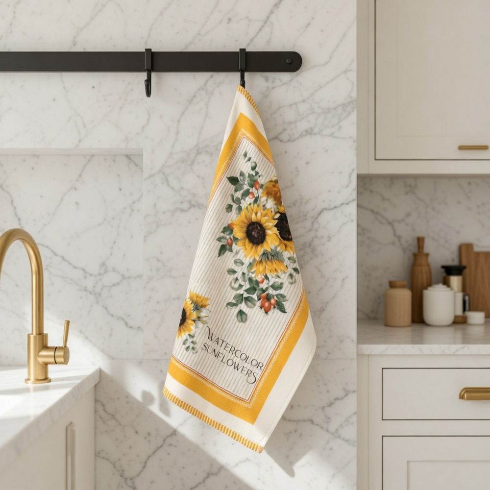 Canovaccio da cucina in 100% cotone con stampa decorativa e colorazioni azo-free, pensato per unire funzionalità e stile in ogni ambiente domestico. Realizzato in filato a spugna, garantisce ottima assorbenza e una piacevole morbidezza al tatto, risultando ideale sia per asciugare le mani che per le stoviglie. La grafica ispirata a luminosi girasoli ad acquerello con dettagli giallo senape e scritta botanica su fondo rigato, impreziosita da una cornice calda color ocra e delicati motivi decorativi lungo il bordo, dona carattere e personalità alla cucina.